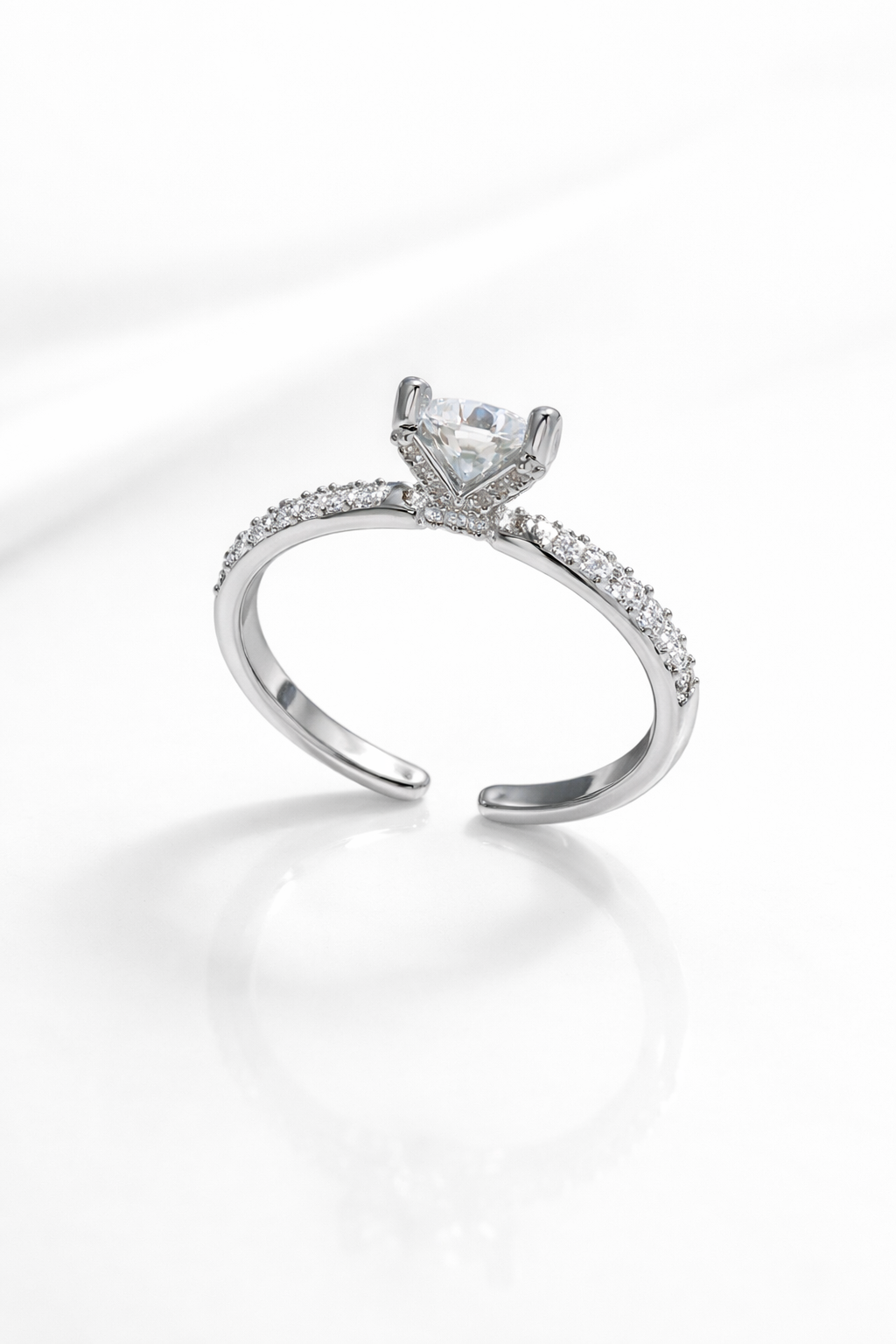 Anel Solitário Coração Cristal com Detalhes nas Laterais com Microzirconias. Confeccionada em Banho de Ródio Branco.